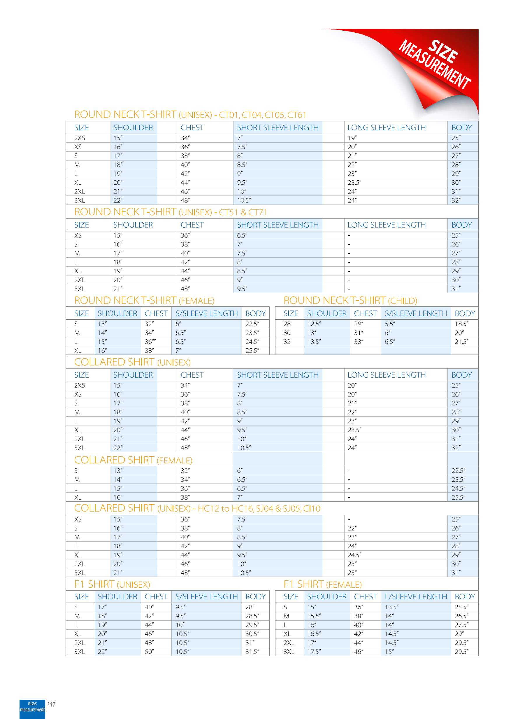 Please refer to charts below for T-Shirts and Uniforms Size Guide. Please take note that size may differs of approx 5%.